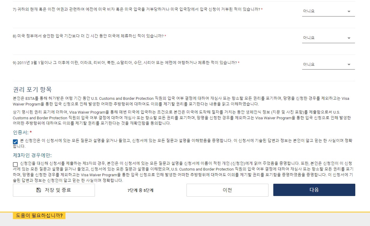 테러리스트나 그런 위험한 걸 막기 위해 자격 요건 질문을 받는다.