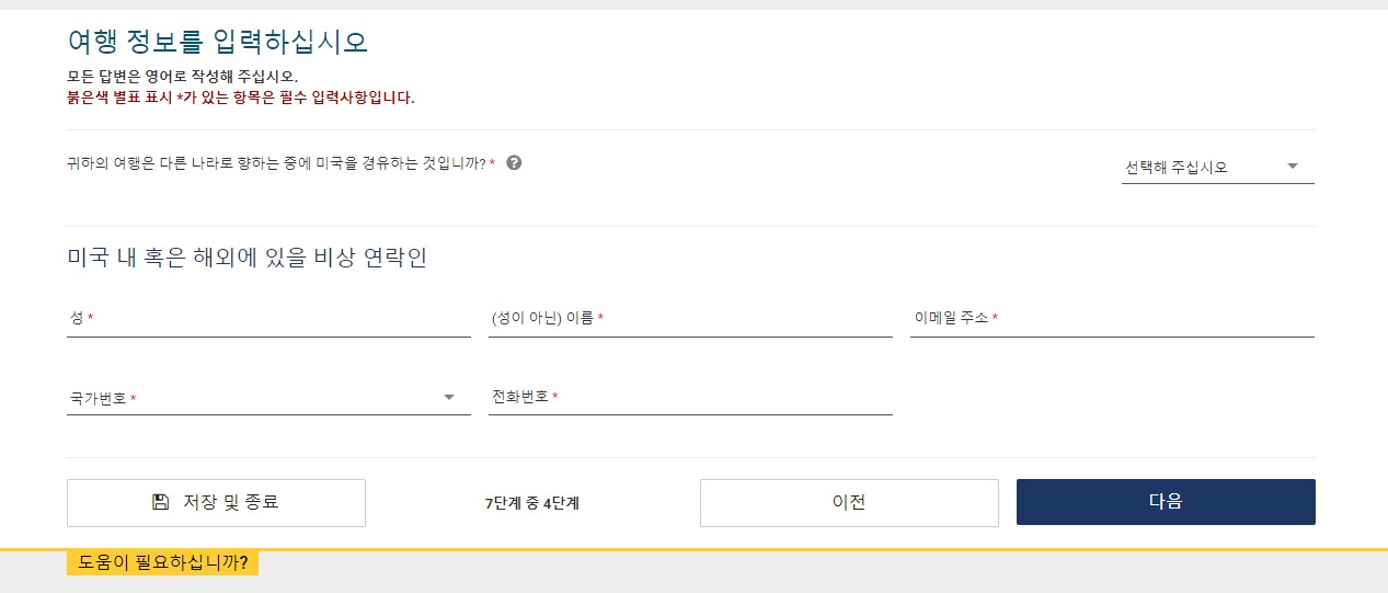 미국 내 혹은 해외에 있을 비상 연락인을 적어준다. 같이 가는 동행인 또는 미국에 있는 지인을 적어주면 되는데